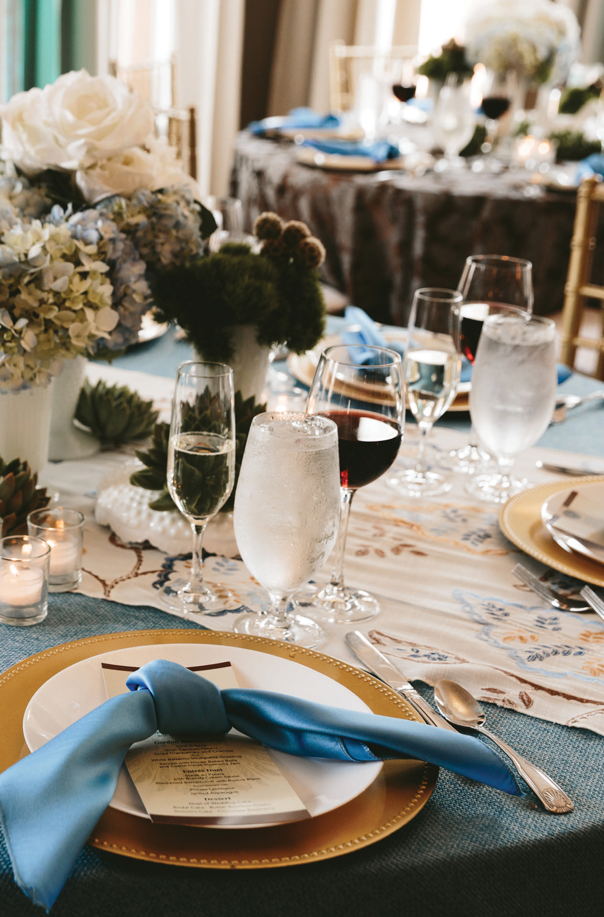 Tables, gold Chiavari chairs, floor-length linens, and chargers are included. Tables are 60-inch rounds that can seat up to 9 or 8-foot-long tables, that can seat up to 10 with guests seated at the ends.